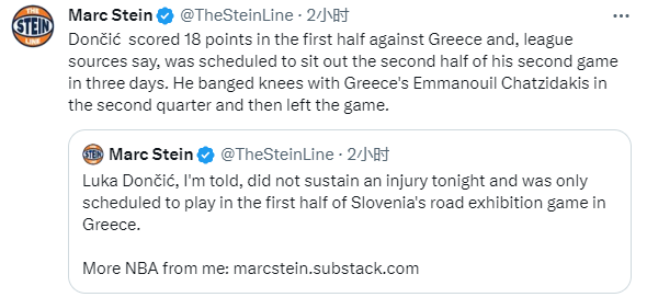 据名记Marc Stein报道,东契奇本来就计划不打与希腊热身赛的下半场,在对阵希腊的比赛中,东契奇上半场拿下18分,斯洛文尼亚3年2战,东契奇缺席下半场的比赛,第二节撞伤膝盖并且退出比赛。