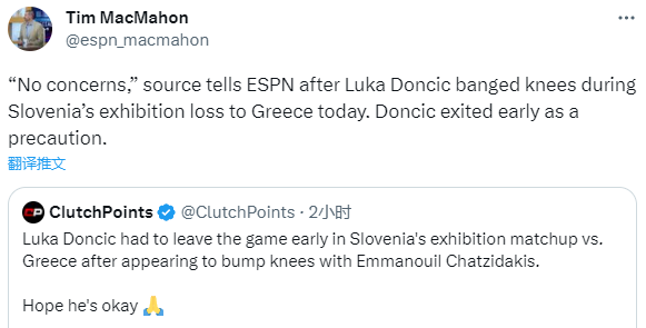 名记Tim MacMahon报道,东契奇在与希腊的比赛中撞伤膝盖,他的伤势无碍,不用担心,只是作为预防措施,东契奇提前退出比赛。
