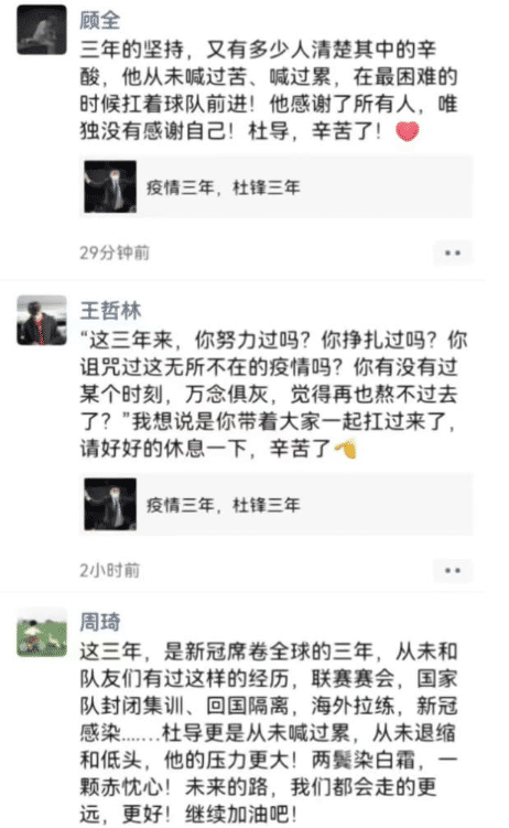 杜锋下课之后,中国男篮的多名球员都在社交媒体上发文送上祝福,其中在杜锋手下机会不是很多的阿不都沙拉木转发杜锋指导的图片,并在评论区留言感慨,称“杜导辛苦了”;