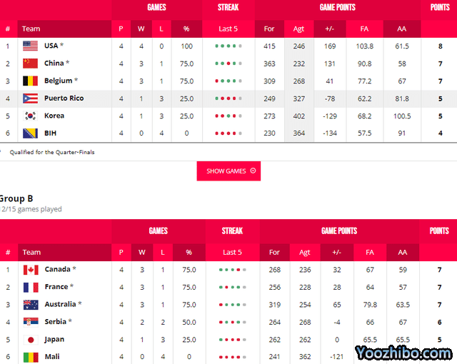 较为扑朔迷离的是B组。目前B组的小组出线队伍已经确定,分别是加拿大、法国、澳大利亚和塞尔维亚,日本和马里已经被淘汰出局。但加拿大、法国和澳大利亚目前都是3胜1负,排名看似还很难说。但从末轮的对阵情况来看,形势会比较清晰。