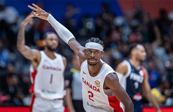 在加拿大95-65大胜法国30分的比赛中,亚历山大全场18投9中轰下27分13篮板6助攻2抢断仅仅1次失误,上半场8中1,但下半场亚历山大12中8迎来大爆发,第三节连得13分带队打爆法国;亚历山大比肩姚明创纪录——自有NBA球员参加世界杯以来,只有三名球员在世界杯比赛中单场至少砍下25分10篮板和5次助攻,这3名球员分别是:姚明(2002年)、博格丹(2019年)和亚历山大。