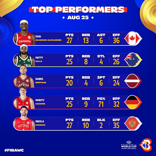 澳大利亚98-72战胜芬兰,米尔斯25分8篮板2助攻4抢断;德国81-63战胜日本,大瓦格纳25分9篮板;黑山91-71战胜墨西哥,武切维奇15投11中轰下27分10篮板2盖帽,统治比赛,关键时刻攻防一体。