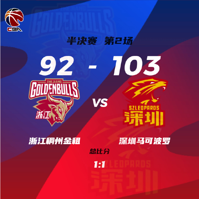 925直播吧4月27日讯 CBA季后赛进入到半决赛,浙江主场继续迎战深圳,两队首场比赛是赖特和萨林杰的精彩对决,最终依靠吴前的两罚全中浙江惊险收下比赛胜利,1-0取得领先。比赛上来双方迅速进入比赛状态,贺希宁和顾全接连外线发炮打出一波10-2小高潮一度建立双位数领先,好在王奕博发挥不错帮助浙江追分,次节深圳突然陷入得分荒,浙江一波7-1直接反超比分,随后深圳还是调整的不好,陆文博单节得分上双帮助浙江打出32-15的比分一举领先到双位数。下半场,浙江进攻端也一筹莫展单节仅10分,虽然深圳命中率也不高,但全民皆兵的他们还是追上比分,末节双方继续胶着,深圳接连造杀伤打出一波10-2小高潮直接反超比分,随后吴前6犯离场,萨林杰接连打成2+1助深圳趁机拉开比分,最终深圳103-92逆转浙江,大比分扳成1-1。
