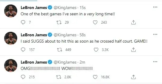 这一记匪夷所思的超级绝杀,同样让在家休养生息的老詹,激动地用流量狂刷推特,表示自己知道萨格斯刚过半场就要投。