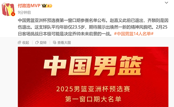 知名篮球记者付政浩解读,称中国男篮亚洲杯预选赛第一窗口期参赛名单公布。这支球队平均年龄仅23.5岁,期待展示出焕然一新的精神风貌吧。2月25日客场挑战日本极可能是决定乔帅未来前景的一战。