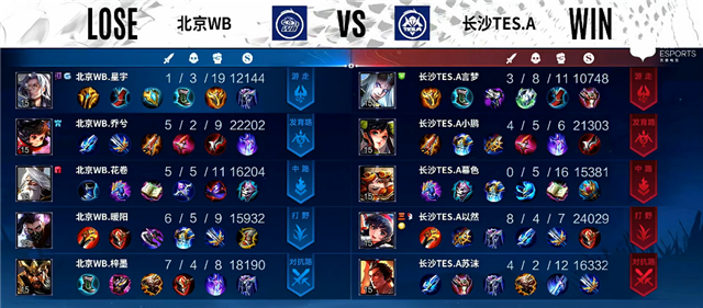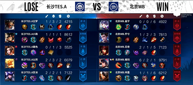 4分10秒镜拿下暴君。5分17秒镜推掉上路一塔。6分50秒镜拿下主宰。9分钟镜抢下暴君,北京WB下路一塔被破。12分钟野区团战,马可波罗拿下一血,北京WB打出0换2。13分钟主宰团,镜拿下主宰,团战长沙TES.A打出0换2。13分45秒老夫子推掉中路一塔。14分钟上路团战,北京WB打出0换2。14分55秒马可波罗推掉中路一塔。16分30秒上路团战,北京WB打出2换3。17分20秒镜拿下暴君。18分45秒镜拿下主宰。19分钟下路团战,北京WB打出0换4。19分28秒北京WB推掉水晶率先拿下一分。