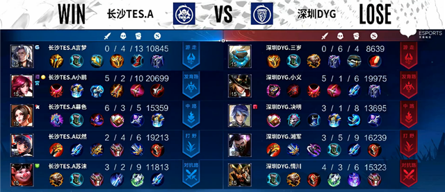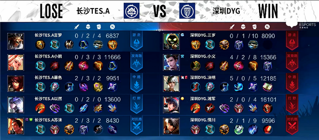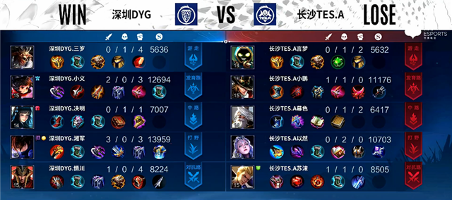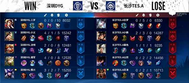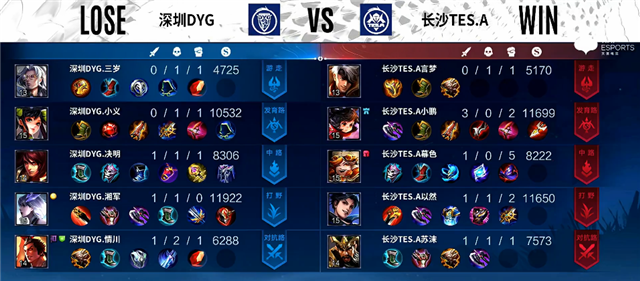 开局长沙TES.A入侵野区,周瑜拿下一血,长沙TES.A打出0换3。2分33秒嬴政拿下主宰。5分30秒娜可露露拿下暴君。5分50秒公孙离推掉上路一塔。7分19秒公孙离被击杀,狄仁杰推掉下路一塔。7分55秒娜可露露拿下主宰。9分20秒娜可露露拿下暴君。10分20秒周瑜推掉中路一塔。10分38秒娜可露露拿下主宰。11分17秒嬴政推掉中路一塔。12分30秒娜可露露拿下暴君。13分钟上路团战,深圳DYG打出1换2。14分38秒娜可露露拿下主宰。15分13秒嬴政推掉中路高地塔。16分20秒娜可露露拿下暴君。18分钟娜可露露拿下主宰。19分钟河道团战,深圳DYG打出0换2。19分40秒高地团战,深圳DYG团灭长沙TES.A。20分03秒深圳DYG推掉水晶率先拿下赛点。
