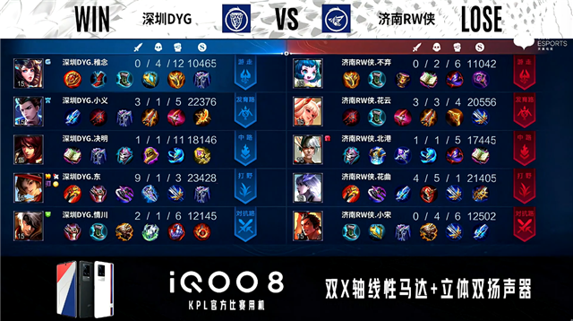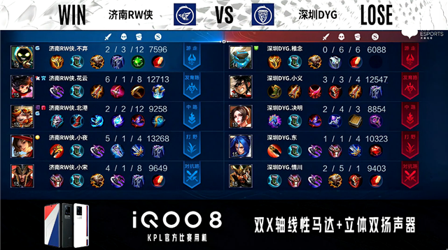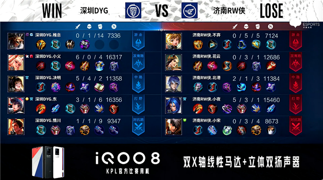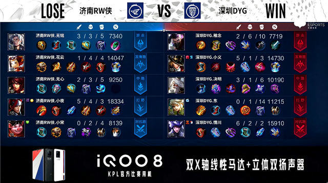 双方常规开局。1分54秒深圳DYG对抗路打出0换2。1分56秒济南RW侠发育路击杀大乔。6分12秒深圳DYG云缨对抗路单杀镜。13分10秒暴君处团战济南RW侠打出1换2并拿下暗影暴君。14分15秒济南RW侠拿下暗影主宰。15分30秒济南RW侠野区击杀大乔。15分41秒济南RW侠摧毁敌方对抗路二塔。17分37秒深圳DYG拿下暗影暴君。18分16秒中路团战济南RW侠击杀狄仁杰。19分09秒济南RW侠拿下暗影主宰。19分34秒对抗路团战深圳DYG打出1换2。20分23秒深圳DYG拿下风暴龙王,团战双方1换1。22分32秒对抗路团战深圳DYG打出1换3。25分30秒济南RW侠拿下风暴龙王。27分07秒济南RW侠摧毁敌方中路高地塔。29分20秒野区团战深圳DYG打出0换3。30分14秒深圳DYG团灭对手摧毁敌方水晶拿下比赛。
