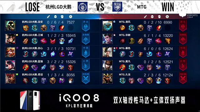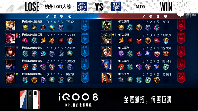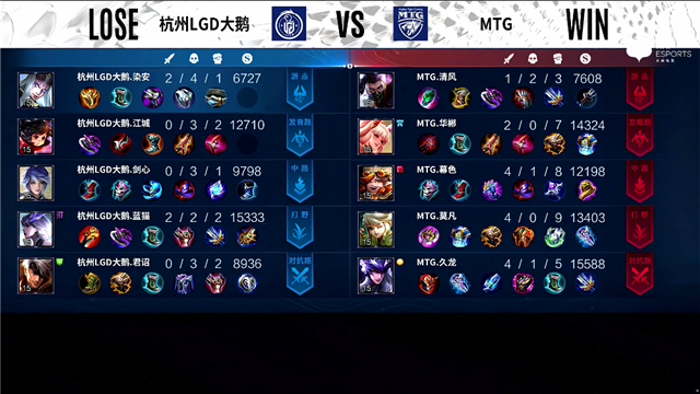 29秒,MTG嬴政中路击杀太乙真人拿下一血。2分15秒,MTG控下暴君,随后杭州LGD大鹅控下先知主宰。2分47秒,上路团,双方1换1。3分30秒,MTG下路打出0换2。5分40秒,杭州LGD大鹅上路越塔打出1换2。6分29秒,MTG控下暴君。7分26秒,MTG击杀太乙真人并破掉杭州LGD大鹅上一塔。9分12秒,杭州LGD大鹅控下先知主宰。9分34秒,杭州LGD大鹅娜可露露下路击杀关羽。10分15秒,杭州LGD大鹅控下暗影主宰。10分51秒,MTG嬴政击杀娜可露露。11分28秒,MTG控下暗影暴君。12分17秒,MTG嬴政磨掉杭州LGD大鹅中一塔。14分55秒,MTG小兵摧毁杭州LGD大鹅下二塔。15分43秒,MTG控下暗影主宰并击杀太乙真人。16分19秒,MTG破掉杭州LGD大鹅上二塔。17分33秒,MTG击杀太乙真人,随后杭州LGD大鹅击杀赵云。18分40秒,杭州LGD大鹅击杀关羽随后控下暗影暴君。19分55秒,双方团,MTG打出1换5团灭对手。20分30秒,MTG中路一波摧毁杭州LGD大鹅水晶,3:0赢下比赛。