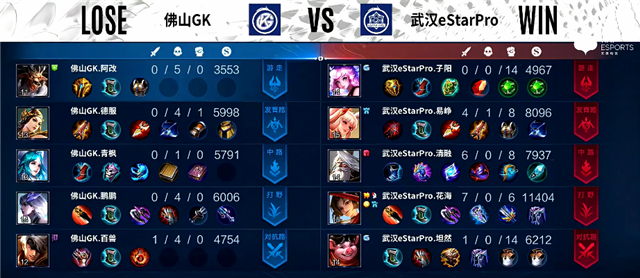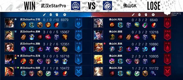 2分19秒云缨拿下暴君,团战武汉eStarPro打出0换3,公孙离拿下一血。4分17秒镜被击杀。4分30秒云缨拿下主宰。6钟下路团战,武汉eStarPro打出0换2,公孙离推掉下路一塔。7分钟野区团战,武汉eStarPro打出1换4。7分41秒公孙离推掉中路一塔。8分30秒牛魔被击杀,公孙离推掉上路二塔。9分10秒公孙离推掉上路高地塔。10分28秒云缨拿下暴君。11分钟云缨推掉中路高地塔,团战团灭佛山GK。11分31秒武汉eStarPro推掉水晶率先拿下赛点。