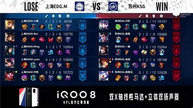 2分34秒,上海EDG.M孙膑击杀刘邦拿下一血。3分07秒,苏州KSG控下先知主宰,随后上海EDG.M控下暴君。3分38秒,苏州KSG团战打出0换2。4分37秒,上海EDG.M击杀梦奇,苏州KSG破掉上海EDG.M下一塔。6分12秒,中路团,苏州KSG打出1换2。7分23秒,上海EDG.M控下暴君,随后苏州KSG控下先知主宰。8分26秒,苏州KSG破掉上海EDG.M中一塔。10分19秒,苏州KSG控下暗影暴君,随后团战打出0换2。10分43秒,苏州KSG破掉上海EDG.M中二塔。12分01秒,苏州KSG控下暗影主宰。12分48秒,苏州KSG破掉上海EDG.M上二塔。14分38秒,苏州KSG控下暗影暴君。16分22秒,苏州KSG控下暗影主宰。17分20秒,苏州KSG破掉上海EDG.M上高地,随后团战双方1换1。18分54秒,苏州KSG控下暗影暴君。19分24秒,上海EDG.M击杀刘邦。20分05秒,双方团,苏州KSG打出2换3。21分11秒,苏州KSG控下风暴龙王。22分13秒,苏州KSG破掉上海EDG.M中高地,随后边团边拆摧毁上海EDG.M水晶赢下比赛。