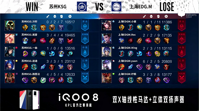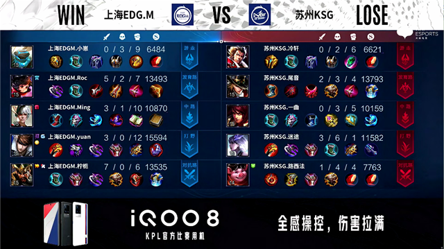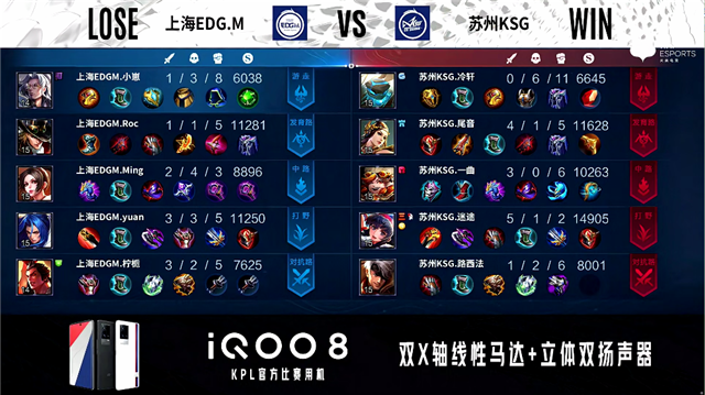 54秒,上海EDG.M廉颇上路击杀蒙恬拿下一血。2分30秒,苏州KSG控下暴君,上海EDG.M控下先知主宰。3分30秒,下路团,双方1换1。5分20秒,双方两处交火最终1换1,苏州KSG破掉上海EDG.M下一塔,上海EDG.M破掉苏州KSG上一塔。5分37秒,苏州KSG破掉上海EDG.M中一塔。7分10秒,上路团,苏州KSG打出0换3。9分14秒,苏州KSG控下先知主宰。9分25秒,上路团,苏州KSG打出2换3,随后破掉上海EDG.M中二塔。10分36秒,苏州KSG控下暗影主宰。11分11秒,苏州KSG上路击杀大乔。11分22秒,苏州KSG破掉上海EDG.M下二塔。11分41秒,上海EDG.M中高地反打击杀公孙离。12分20秒,苏州KSG橘右京抢到暗影暴君,但橘右京被上海EDG.M击杀。13分46秒,上海EDG.M破掉苏州KSG上二塔。14分26秒,苏州KSG破掉上海EDG.M中高地,上海EDG.M狄仁杰拿下双杀。15分03秒,上海EDG.M控下暗影主宰。16分59秒,苏州KSG西施抢到暗影暴君。17分58秒,双方团,上海EDG.M击杀蒙恬。18分57秒,中路团,上海EDG.M打出1换3。19分33秒,上海EDG.M破掉苏州KSG上高地。20分20秒,上海EDG.M击杀蒙恬。21分02秒,上海EDG.M控下风暴龙王。21分26秒,上海EDG.M破掉苏州KSG下二塔,随后苏州KSG击杀弈星。25分45秒,苏州KSG拿到风暴龙王。26分40秒,苏州KSG下路一波摧毁上海EDG.M水晶再下一城。
