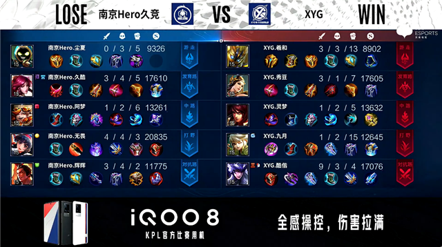 双方常规开局。1分2分13秒南京Hero拿下主宰,XYG拿下暴君。3分02秒野区团战XYG击杀孙膑拿到一血。3分25秒南京Hero发育路击杀姜子牙。5分17秒XYG野区击杀西施。6分33秒XYG野区击杀猪八戒。6分45秒XYG摧毁敌方中路外塔。10分28秒中路XYG打出1换2。11分11秒南京Hero拿下暗影主宰。14分32秒中路团战XYG打出1换3。14分52秒XYG摧毁敌方发育路高地塔。15分05秒XYG团灭对手摧毁水晶拿下比赛。