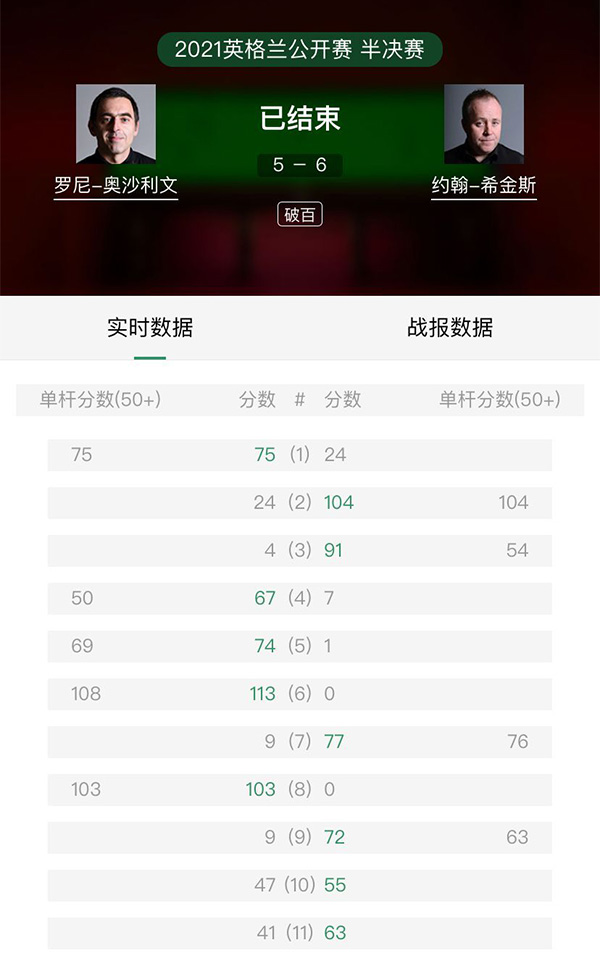 925直播吧讯北京时间11月7日消息,2021斯诺克英格兰公开赛结束半决赛的争夺。首场半决赛,“火箭”罗尼-奥沙利文,以5-6被巫师”约翰-希金斯逆转。第一局,奥沙利文单杆75分,以75比24拿下。第二局,希金斯单杆104分,以104比24拿下。第三局,希金斯单杆54分,以91比4拿下。第四局,奥沙利文单杆50分,以67比7拿下。双方2-2。第五局,奥沙利文单杆69分,以71比1拿下。第六局,奥沙利文单杆108分,以113比0拿下。奥沙利文4-2建立优势。第七局,希金斯单杆76分,以77比9拿下。第八局,奥沙利文单杆103分拿下。奥沙利文5-3赛点。