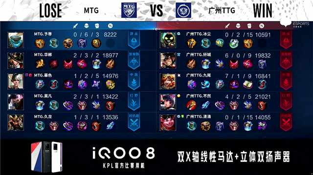 2分18秒,广州TTG控下暴君,随后MTG控下先知主宰。4分40秒,广州TTG破掉MTG下一塔。6分21秒,广州TTG破掉MTG上一塔。6分36秒,广州TTG控下暴君。7分59秒,广州TTG张飞大招控住敌方四人助队伍团战打出1换3,姜子牙拿下双杀,随后破掉MTG下二塔。8分46秒,广州TTG控下先知主宰。9分10秒,上路团,双方1换1,广州TTG破掉MTG上二塔。10分30秒,广州TTG控下暗影暴君。11分06秒,双方团,广州TTG打出0换3并破掉MTG中一塔。11分45秒,广州TTG破掉MTG中二塔。12分26秒,广州TTG控下暗影主宰。13分30秒,下路团,广州TTG打出1换2,随后破掉MTG下、中两座高地。15分钟,广州TTG控下暗影暴君。16分17秒,上路团,广州TTG越高地打出0换3,随后一波摧毁MTG水晶先下一城。