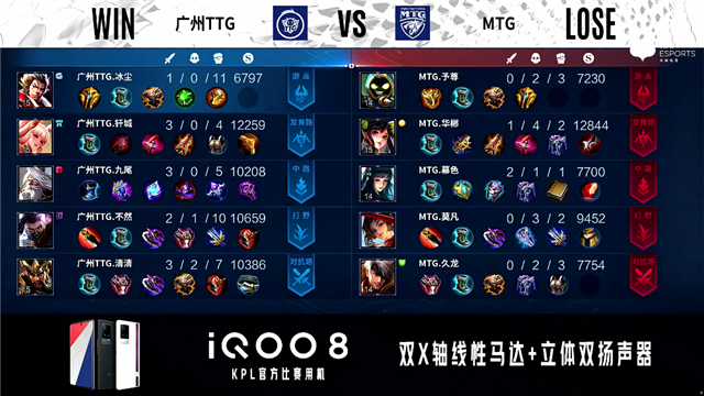 双方和平开局。2分58秒,广州TTG蒙犽抢到暴君。5分13秒,广州TTG控下先知主宰,双方团战1换1。5分42秒,广州TTG中路击杀嬴政。5分57秒,广州TTG下路击杀马可波罗,随后破掉MTG下一塔。7分04秒,广州TTG击杀盾山,随后控下暴君。9分11秒,广州TTG破掉MTG上一塔。9分28秒,广州TTG破掉MTG上二塔。9分57秒,广州TTG中路击杀嬴政,随后再击杀盾山。10分58秒,广州TTG控下暗影暴君。11分40秒,广州TTG控下暗影主宰。12分12秒,广州TTG击杀关羽并破掉MTG下二塔。12分47秒,广州TTG破掉MTG中二塔。13分58秒,双方团战1换1。15分04秒,广州TTG上路击杀关羽。15分45秒,广州TTG击杀马可波罗随后破掉MTG上高地。16分15秒,广州TTG控下暗影暴君。16分40秒,广州TTG控下暗影主宰。18分05秒,MTG击杀太乙真人。20分30秒,广州TTG击杀盾山后拿到风暴龙王。21分05秒,广州TTG破掉MTG中高地及下高地。22分25秒,MTG团战打出1换2。25分06秒,广州TTG击杀兰陵王。25分31秒,广州TTG控下风暴龙王。26分20秒,广州TTG强冲MTG高地打出1换4,随后摧毁MTG水晶3:0赢下比赛。