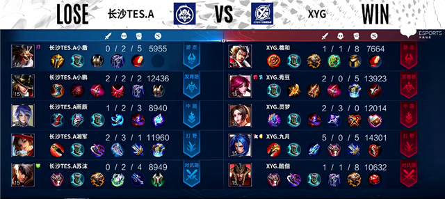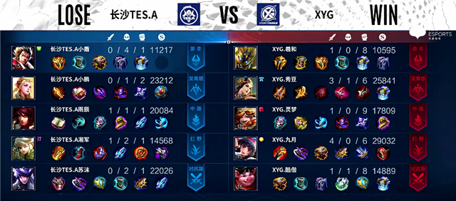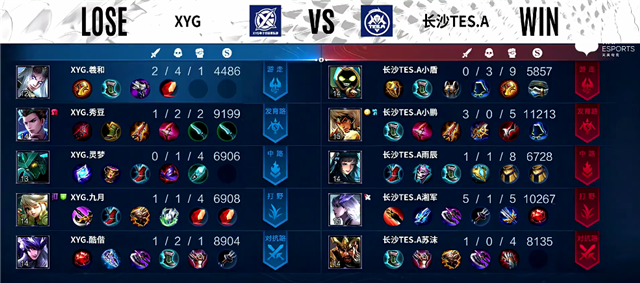 1分40秒野区团战,橘右京拿下一血。2分25秒橘右京拿下主宰。4分钟橘右京拿下暴君。5分钟云缨在上路被击杀。5分30秒野区团战,双方1换1。6分50秒长沙TES.A边路一塔被破。7分40秒XYG推掉中路一塔,团战双方1换1。9分钟橘右京拿下暴君。10分14秒橘右京拿下主宰。11分45秒张飞推掉中路高地塔,云缨被击杀。12分30秒橘右京拿下暴君。13分40秒伽罗推掉上路高地塔。14分30秒橘右京拿下主宰。15分钟下路团战,双方1换1。16分40秒橘右京拿下暴君。17分20秒伽罗推掉下路高地塔,团战XYG团灭长沙TES.A。17分49秒XYG推掉水晶率先拿下赛点。