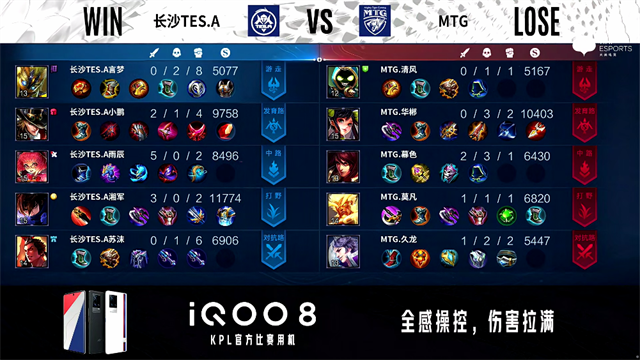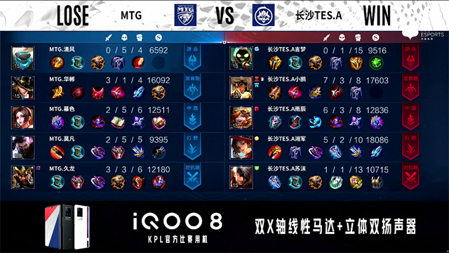 1分47秒,中路团,双方1换1。2分32秒,上路团,长沙TES.A鲁班大师上路拿下双杀。3分20秒,长沙TES.A控下先知主宰。3分33秒,MTG破掉长沙TES.A下一塔。5分17秒,长沙TES.A拿下暴君。6分17秒,长沙TES.A上路打出0换2。6分58秒,长沙TES.A鲁班大师击杀阿古朵。8分10秒,长沙TES.A控下先知主宰。9分43秒,长沙TES.A控下暴君。10分29秒,长沙TES.A控下暗影主宰,随后团战MTG打出2换3。12分49秒,长沙TES.A抢到暗影暴君。15分13秒,长沙TES.A控下暗影主宰,随后团战MTG打出1换4,马超拿下三杀。15分35秒,长沙TES.A破掉MTG中路两座外塔。15分54秒,MTG击杀敌方最后一人鲁班大师后,中路一波摧毁长沙TES.A水晶再扳一城。