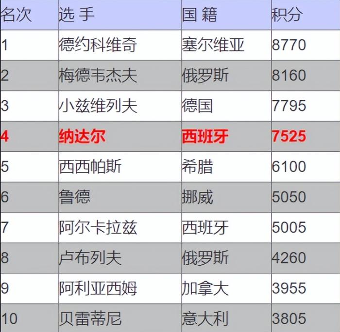 法网男单赛场,各路种子选手几乎纷纷杀入8强。纳达尔接连击败德约科维奇、小兹维列夫和鲁德,最终第14次捧起火枪手杯。凭借如此出色的表现,纳达尔积分涨至7525分,重返世界第4。这样的排名,能够避免在任何比赛的半决赛之前遇到德约科维奇。