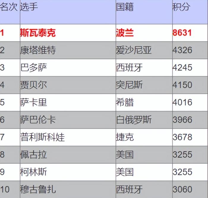 女单方面,豪取35连胜的斯瓦泰克,继续稳坐世界第一宝座。新赛季,他已经拿下6个单打冠军,总奖金超过500万美元。她目前的积分是8631分,几乎是第二名的两倍。由于本届法网中,女单TOP10球员的发挥极为惨淡,除了斯瓦泰克无人进入第二周。因此,斯瓦泰克接近4300分的领先优势,甚至会让年终世界第一也几乎失去悬念。
