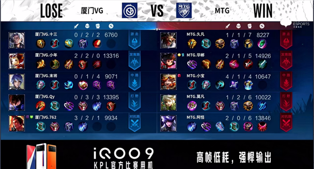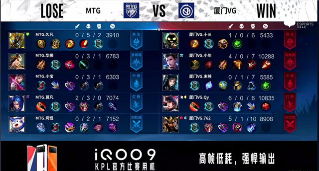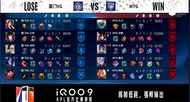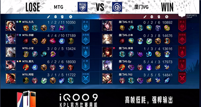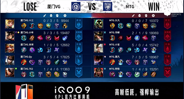 1分53秒,厦门VG上路越塔击杀梦琪拿下一血。2分13秒,MTG控下暴君。3分02秒,厦门VG控下先知主宰。3分44秒,厦门VG下路击杀梦琪。4分35秒,厦门VG破掉MTG上一塔。5分11秒,厦门VG破掉MTG下一塔。5分22秒,上路团,厦门VG打出0换3。6分19秒,下路团,厦门VG打出0换2,随后破掉MTG下二塔。7分01秒,厦门VG控下暴君。7分28秒,厦门VG上路击杀鬼谷子。8分17秒,厦门VG狄仁杰破掉MTG中一塔。9分20秒,上路团,厦门VG打出0换2。10分17秒,厦门VG拿下暗影主宰。11分18秒,厦门VG关羽击杀鬼谷子。11分35秒,厦门VG破掉MTG中二塔,随后团战打出1换3。12分16秒,厦门VG先后破掉中上高地,随后一波摧毁水晶连追二局。