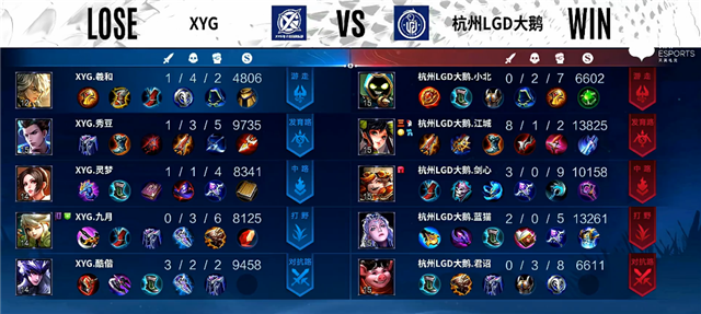 2分40秒下路团战,沈梦溪拿下一血。3分40秒不知火舞抢下暴君。4分50秒下路团战,张良被击杀。5分10秒下路团战,双方1换1。5分40秒狄仁杰推掉下路一塔。5分50秒露娜拿下主宰。6分30秒中路团战,XYG打出2换3。8分04秒孙尚香推掉上路一塔。8分10秒暴君团,露娜拿下暴君,杭州LGD大鹅打出1换2。8分40秒露娜推掉中路一塔。10分20秒露娜拿下主宰,阿古朵拿下暴君。12分钟杭州LGD大鹅推掉上路高地塔。13分钟杭州LGD大鹅推掉中路高地塔。14分钟露娜拿下暴君,阿古朵被击杀。14分40秒高地团战,孙尚香拿下三杀。14分46秒杭州LGD大鹅推掉水晶追回一分。