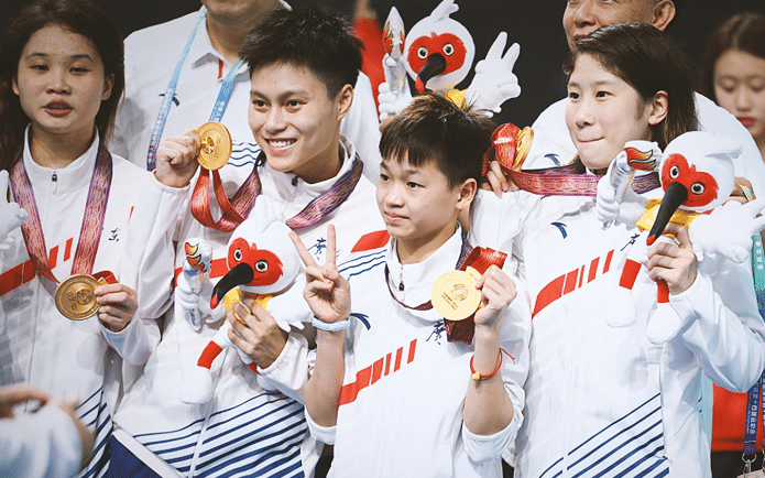 来源:925直播吧09-07 09:56925直播吧9月07日讯全运会第一个引发全民关注的项目是跳水女子团体,全红婵所在的广东队成功夺冠,河北队和东道主陕西队斩获银牌和铜牌。这其中大家关注的焦点是新科奥运会金牌得主全红婵,她的表现也很出色,在自己的10米台项目中,力压张家齐、陈芋汐等人拿下第一名,为广州队贡献413.90分。6日晚上所有比赛结束,全红婵与队友们站上最高领奖台,一起庆祝拿下全运会跳水首金。