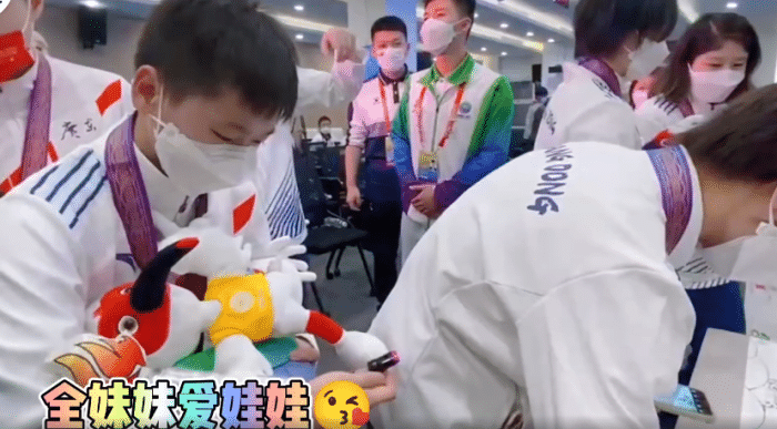 在颁奖仪式之后,全红婵和广东队的队友们一起参加赛后新闻发布会,他们依次留下自己的签名,队友们都在签名,全红婵和队友打闹,她被对手塞满了吉祥物等东西,可以用“收获满满”来形容。