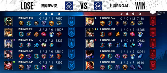 1分30秒中路团战,东皇太一拿下一血。1分55秒蒙恬推掉上路一塔。2分17秒云缨拿下主宰。4分20秒河道团战,上海RNG.M打出0换2,赵云推掉上路一塔。5分40秒赵云拿下暴君。6分钟河道团战,上海RNG.M打出0换2。6分47秒公孙离推掉下路一塔。7分11秒云缨被击杀。7分45秒赵云拿下主宰。9分45秒济南RW侠中路一塔被破。9分50秒云缨拿下暴君。11分20秒云缨拿下主宰。12分57秒云缨拿下暴君,团战上海RNG.M打出0换1。14分钟上海RNG.M推掉中下两路高地塔。15分钟云缨拿下主宰。16分30秒高地团战,济南RW侠打出1换2。17分钟赵云拿下暴君。17分15秒虞姬推掉中路一塔。18分钟中路团战,双方1换1。18分20秒河道团战,济南RW侠打出3换4。20分27秒赵云拿下风暴龙王。22分钟高地团战,东皇太一被击杀。23分40秒中路团战,双方1换1。24分50秒风暴龙王团,云缨拿下风暴龙王,团战上海RNG.M打出1换2。25分25秒上海RNG.M推掉水晶率先拿下赛点。