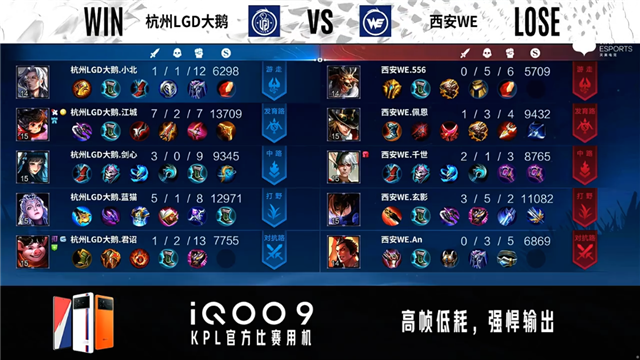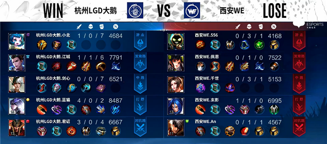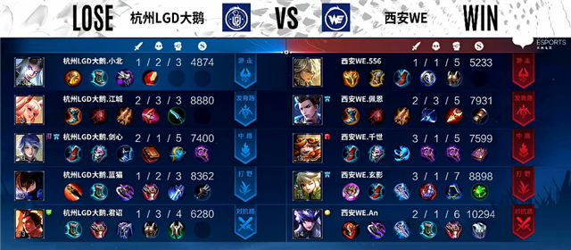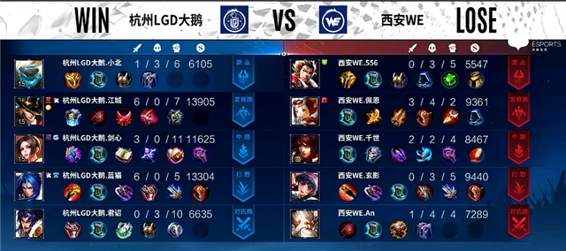1分10秒橘右京入侵野区拿下一血。2分钟老夫子被击杀,橘右京推掉上路一塔。2分27秒娜可露露拿下暴君。2分40秒橘右京拿下主宰。3分30秒下路团战,鲁班七号被击杀。5分钟马可波罗推掉下路一塔。5分50秒老夫子被击杀。7分钟橘右京拿下暴君。7分40秒野区团战,杭州LGD大鹅打出1换4。8分10秒马可波罗推掉下路高地塔。9分钟马可波罗推掉中路一塔,橘右京拿下主宰。10分20秒橘右京拿下主宰。10分30秒野区团战,杭州LGD大鹅打出0换2。12分钟橘右京拿下暴君。14分10秒橘右京拿下主宰。15分钟高地团战,杭州LGD大鹅团灭西安WE,马可波罗拿下三杀。15分32秒杭州LGD大鹅推掉水晶拿下本场比赛胜利。