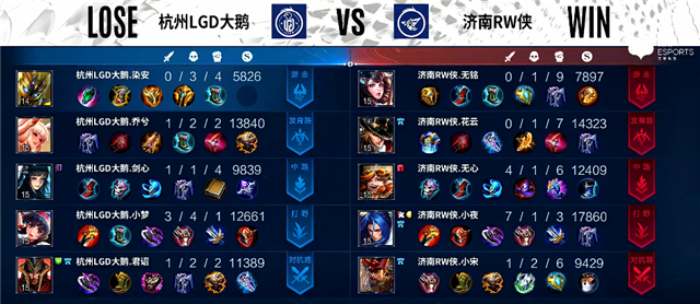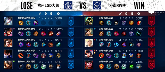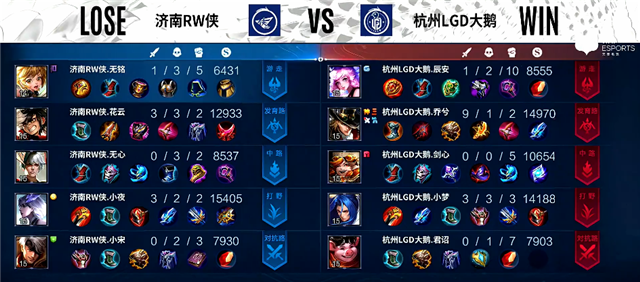 双方和平开局。2分13秒镜拿下暴君,橘右京拿下主宰。4分钟下路团战,马可波罗拿下一血,马可波罗推掉下路一塔。6分44秒河道团战,双方1换1。7分钟沈梦溪推掉下路一塔。8分钟橘右京拿下主宰。8分40秒瑶被击杀。9分钟嬴政被击杀。11分钟暴君团,瑶被击杀。11分50秒橘右京被击杀。14分05秒蒙犽推掉中路一塔。14分47秒橘右京拿下主宰。15分10秒中路团战,杭州LGD大鹅打出1换4,马可波罗推掉下路高地塔。18分钟高地团战,杭州LGD大鹅团灭济南RW侠。18分53秒杭州LGD大鹅推掉水晶率先拿下一分。