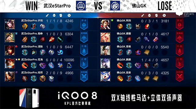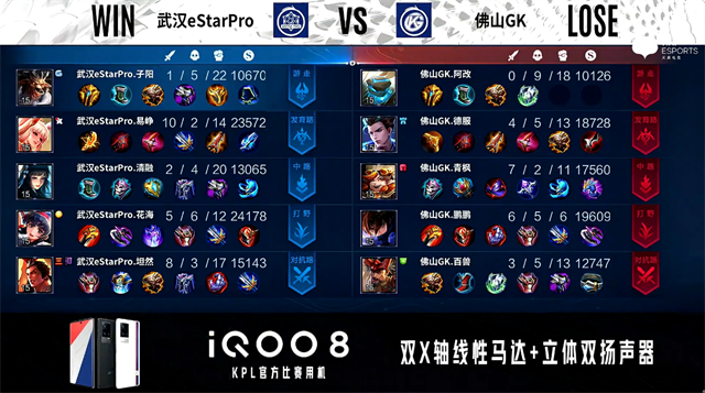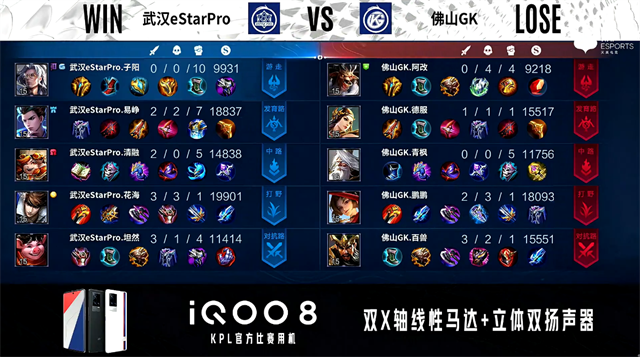 双方常规开局。1分19秒野区团战武汉eStar打出0换2。4分06秒佛山GK拿下暴君。武汉eStar反掉蓝BUFF。5分08秒武汉eStar摧毁敌方发育路二塔。6分09秒野区团战武汉eStar打出1换3。6分33秒武汉eStar摧毁敌方发育路高地塔。6分40秒武汉eStar摧毁敌方中路外塔。6分54秒武汉eStar野区击杀镜。7分55秒武汉eStar中路击杀梦奇。8分41秒武汉eStar对抗路击杀梦奇。9分02秒高地团战武汉eStar击杀公孙离。9分32秒武汉eStar摧毁敌方水晶拿下比赛。