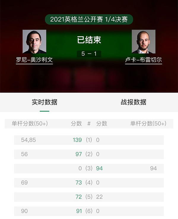 925直播吧讯北京时间11月06日,英格兰公开赛1/4决赛,奥沙利文5-1绅士横扫布雷切尔晋级4强。比赛伊始奥沙利文便火力全开,仅用时8分钟便完成连续两杆50+,单局139-0布雷切尔气吞山河。而布雷切尔显然对于火箭开场操作打懵,第二局再次防守不到位,奥沙利文再添单杆56分2-0领先。前两局轻松获胜的火箭稍有放松,第三局小角度拼中袋不中漏下绝佳机会,平静呼吸的布雷切尔轰出单杆94分还以颜色。随后布雷切尔又一次第一杆便漏球,火箭一杆致命3-1进入中场休息。下半场布雷切尔一杆超级大翻袋上手,但随后再次失误送机会,奥沙利文围球33分后贴库红球不中留下袋口,面对大好球形“比利时子弹”再次薄球失误,奥沙利文接管一杆制胜拿到赛点。大比分落后的布雷切尔没了心气,奥沙利文乘胜追击5-1大胜布雷切尔。