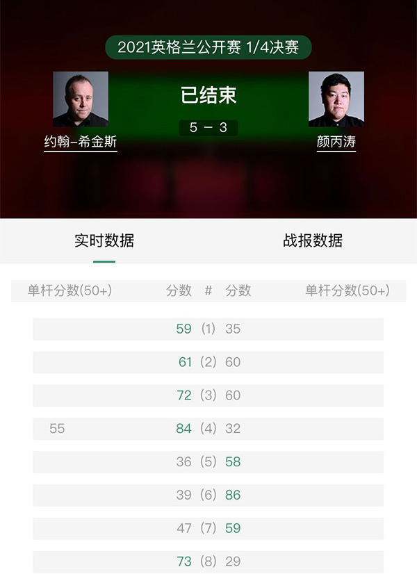 2021斯诺克英格兰公开赛1/4决赛 希金斯vs颜丙涛 全场录像回放