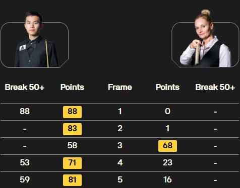 925直播吧讯 2024年斯诺克苏格兰公开赛资格赛第1轮,中国选手刘宏宇对阵女子世锦赛冠军瑞妮-埃文斯,最终,刘宏宇以4-1的比分战胜对手,成功晋级。