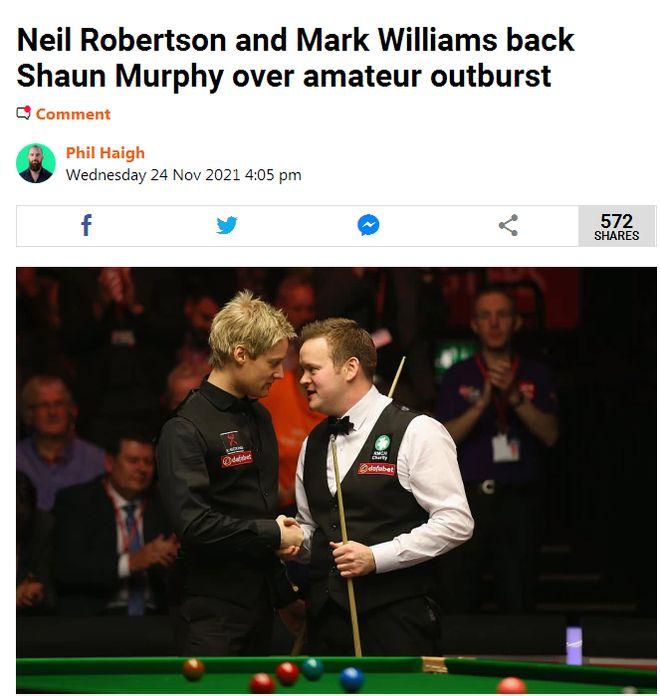 而今天罗伯逊输球之后也对墨菲的言论表示支持,“我完全理解墨菲,当你和中国军团比赛的时候,他们中有些人是业余选手,当然,其中也有业余球员和世界前50名选手一样出色。”另外两位拿过世界冠军的名将塞尔比和马克-威廉姆斯也对这样的观点表达了支持,不过两人的观点是围绕Q School(斯诺克职业球员资格赛)来表述的,认为只有通过Q School的选拔才应该有资格和他们同场竞技。