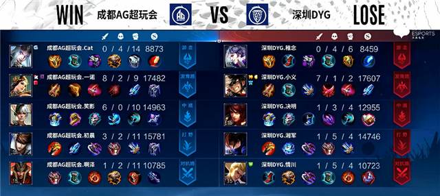2分34秒娜可露露拿下暴君,西施拿下一血。4分40秒下路团战,张飞被击杀。6分钟野区团战,双方1换1。6分40秒孙尚香推掉中路一塔。7分钟盘古拿下暴君。8分40秒娜可露露拿下主宰。9分07秒深圳DYG上路一塔被破。10分17秒娜可露露拿下主宰。10分27秒暴君团,老夫子被击杀。11分24秒盘古拿下暴君。12分15秒孙尚香推掉中路高地塔。15分钟高地团战,孙尚香推掉上路高地塔。15分30秒成都AG超玩会推掉水晶拿下本场比赛胜利。