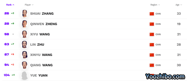 另一名00后小将王曦雨则继续排名第58位,这一排名也是她生涯最高。zhu琳排名上升7位,来到第63位。而王欣瑜则是下滑9位,来到第87位。此外,王蔷排名第94位,共有6名中国选手进入前100。刚刚在W60挑战赛上拿到亚军的袁悦,排名来到104位,距离前100只有一步之遥。