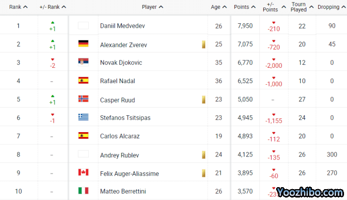 纳达尔凭借法网的2000分,已经来到世界第4。法网打入决赛的鲁德来到世界第5,西西帕斯降至第6位。7-10名分别是西班牙天才少年阿尔卡拉斯,俄罗斯选手卢布列夫,加拿大天才阿历亚西姆,意大利选手贝雷蒂尼。