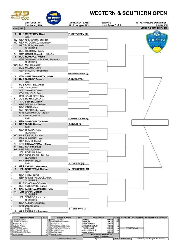 来源:925直播吧08-15 16:47925直播吧讯 罗杰斯杯将于明天决出最终的冠军,而马上接档而至的辛辛那提大师赛也于昨日公布了男单正赛签表。