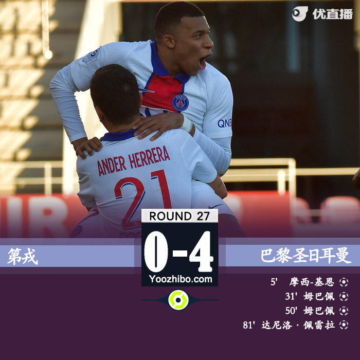 925直播吧2月28日讯 北京时间2月28日0点,法甲第27轮巴黎圣日耳曼客场对阵第戎。上半场,基恩早早为巴黎取得领先,科雷亚造点,姆巴佩点射破门。下半场,姆巴佩梅开二度,达尼洛-佩雷拉终场前再入一球,全场比赛结束,巴黎圣日耳曼4-0第戎。本场比赛后巴黎在多胜一场的情况下反超里昂升到联赛第二,落后榜首的里尔1分。