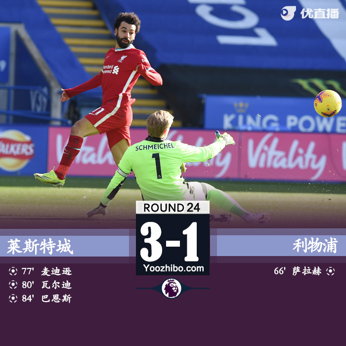 925直播吧2月13日讯北京时间2月13日20点30分,英超第24轮莱斯特城主场迎来强敌利物浦。上半场,米尔纳伤退,利物浦呈现围攻之势但未能破门,小舒梅切尔多次做出成功扑救,瓦尔迪反击射中横梁。下半场,阿诺德任意球攻门击中横梁,萨拉赫兜射破门,麦迪逊任意球扳平比分,利物浦后防失误送礼,瓦尔迪打进反超球,巴恩斯锁定胜局,全场比赛结束,莱斯特城3-1利物浦。本场比赛过后,莱斯特城在多赛2场的情况下拿到46分升到积分榜第二,落后榜首的曼城4分。利物浦遭遇三连败后则是以40分继续排在第四,在先赛一场的情况下仅领先身后的切尔西和西汉姆1分。