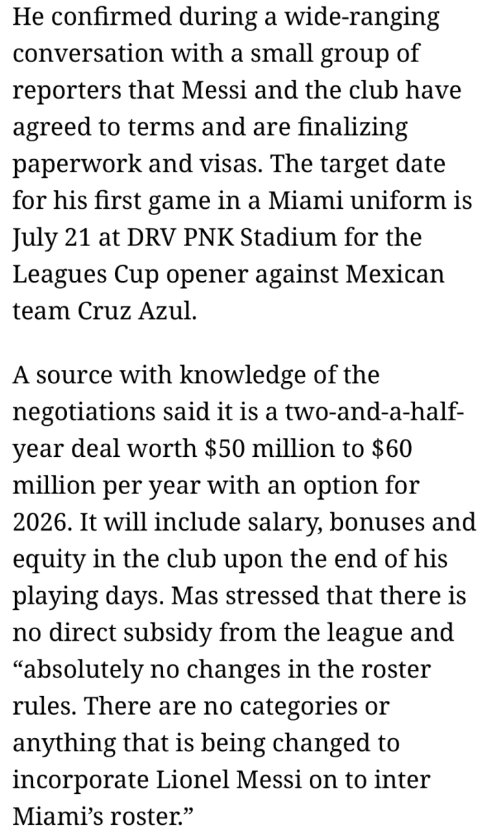 迈阿密国际老板证实梅西签约2年半!年收入6000万,首秀时间确定