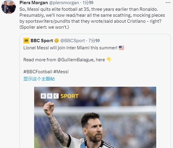 :“梅西在35岁时退出精英足球,比C罗早三年。据推测,我们现在会读到体育记者们写和C罗同样严厉、嘲讽的文章对吧?”