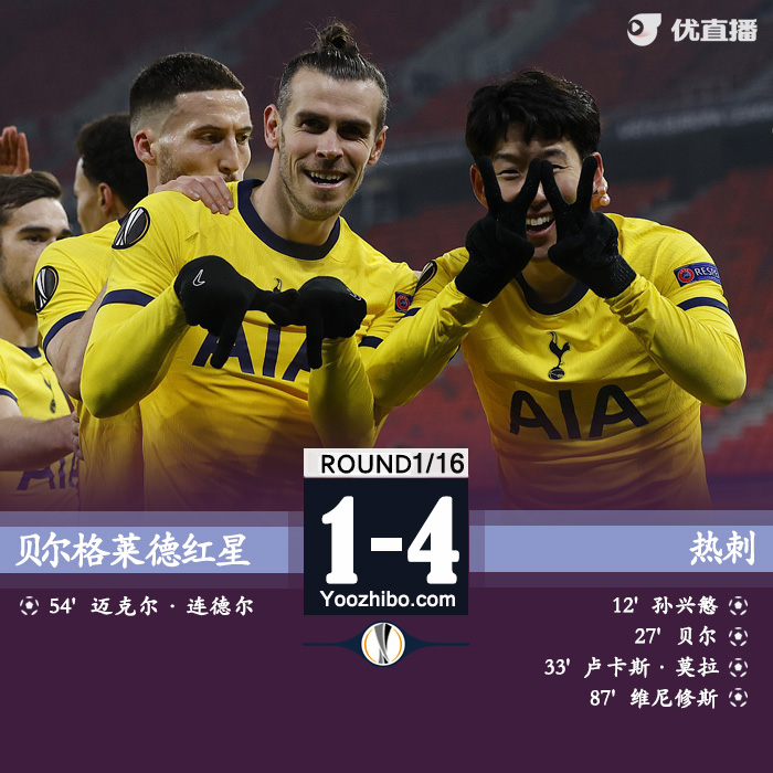 925直播吧2月19日讯 北京时间2月19日01:55,欧联杯1/16决赛首回合,沃尔夫斯贝格迎战热刺。上半场,孙兴慜头球首开记录,贝尔传射,小卢卡斯一条龙破门,热刺半场3-0领先沃尔夫斯贝格。下半场,西索科送点,维尼修斯破门。最终,热刺4-1战胜沃尔夫斯贝格。