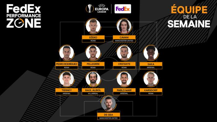925直播吧讯 欧联杯半决赛结束,曼联淘汰罗马,与淘汰了阿森纳的比利亚雷亚尔会师决赛。今日,欧足联官方公布了本周欧联杯最佳阵容。