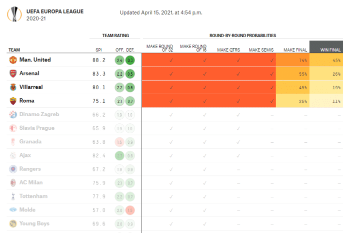 来源:925直播吧04-16 16:33925直播吧4月16日讯 欧联杯四强出炉了,曼联、罗马、比利亚雷亚尔和阿森纳进入了欧联杯四强,而其中曼联将要对阵罗马,比利亚雷亚尔要对阵阿森纳,首回合的比赛在当地时间4月29日举行,次回合的比赛在当地时间5月6日举行(北京时间都要晚一天)。而其中,曼联和比利亚雷亚尔都是先主后客。而大数据网站“538”也更新了本赛季欧联杯夺冠的几率,其中曼联是最大的热门。
