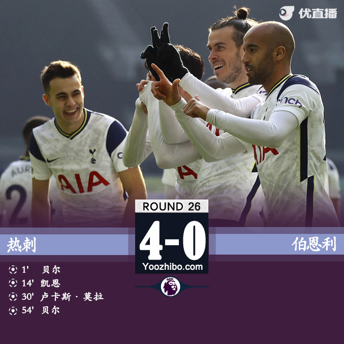 925直播吧讯 北京时间2月28日22:00,英超第26轮继续进行,热刺坐镇主场迎战伯恩利。上半场开场68秒,贝尔接孙兴慜助攻打进闪电进球帮热刺取得领先,此球为英超球队对阵伯恩利的最快进球,随后贝尔又送出长传助攻凯恩扩大比分,雷吉隆助攻小卢卡斯再入一球。下半场,贝尔再次接孙兴慜助攻完成双响。最终,热刺4-0大胜伯恩利,结束两连败。