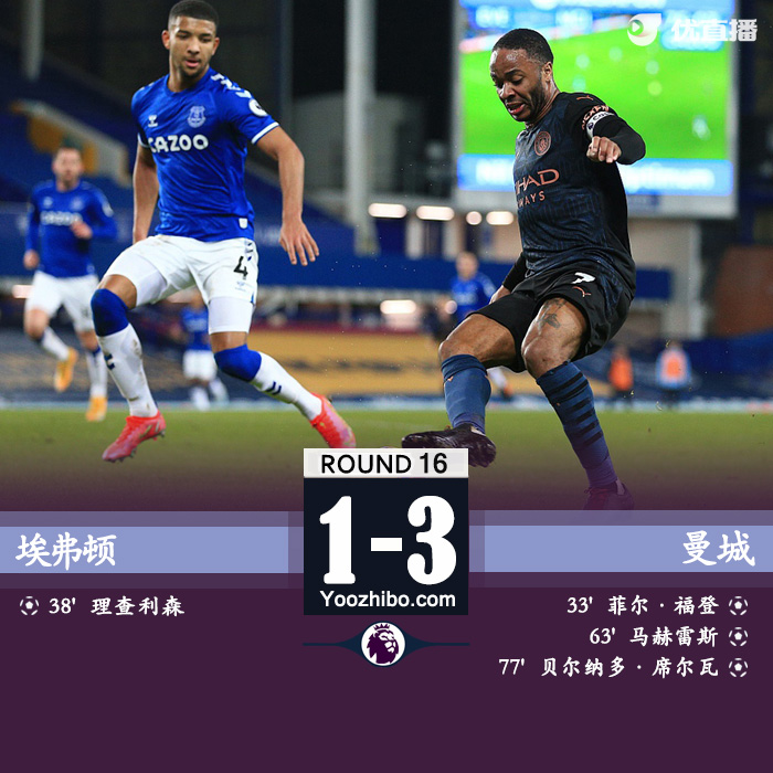 925直播吧2月18日讯 北京时间2月18日凌晨4:15,英超联赛第16轮一场补赛打响,曼城做客挑战埃弗顿。上半场,米纳受伤离场,福登先拔头筹,理查利森扳平比分。下半场,马赫雷斯世界波破门,B席远射再下一城。全场比赛结束,曼城3-1力克埃弗顿,各项赛事豪取17连胜。