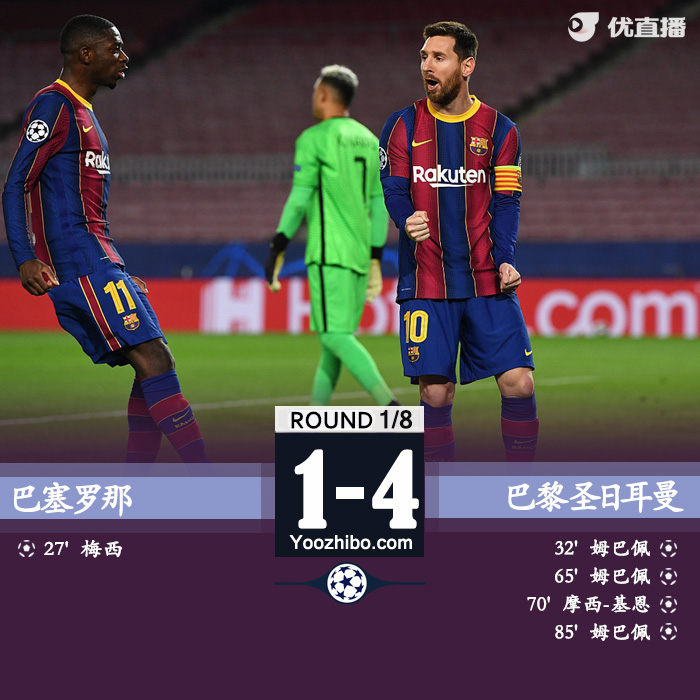 925直播吧2月17日讯 北京时间2月17日凌晨4点整,2020-21赛季欧冠1/8决赛首回合在诺坎普球场展开角逐,巴塞罗那坐镇主场迎战巴黎圣日耳曼。上半场梅西点射打破僵局,姆巴佩扳平比分,下半场姆巴佩上演帽子戏法,基恩破门。最终巴塞罗那主场1-4遭巴黎圣日耳曼逆转,双方将于3月11日移师巴黎王子公园球场进行次回合较量。
